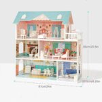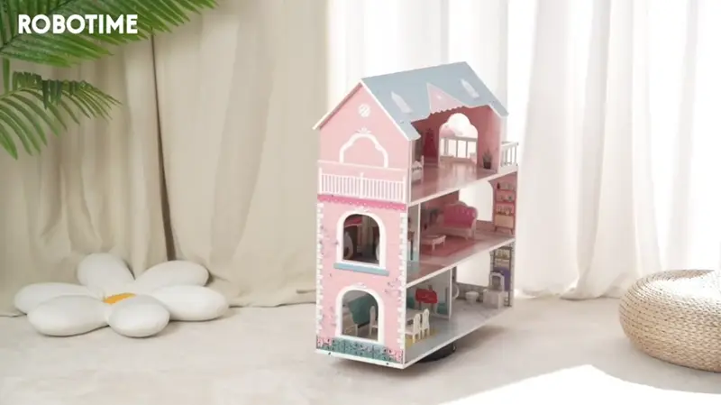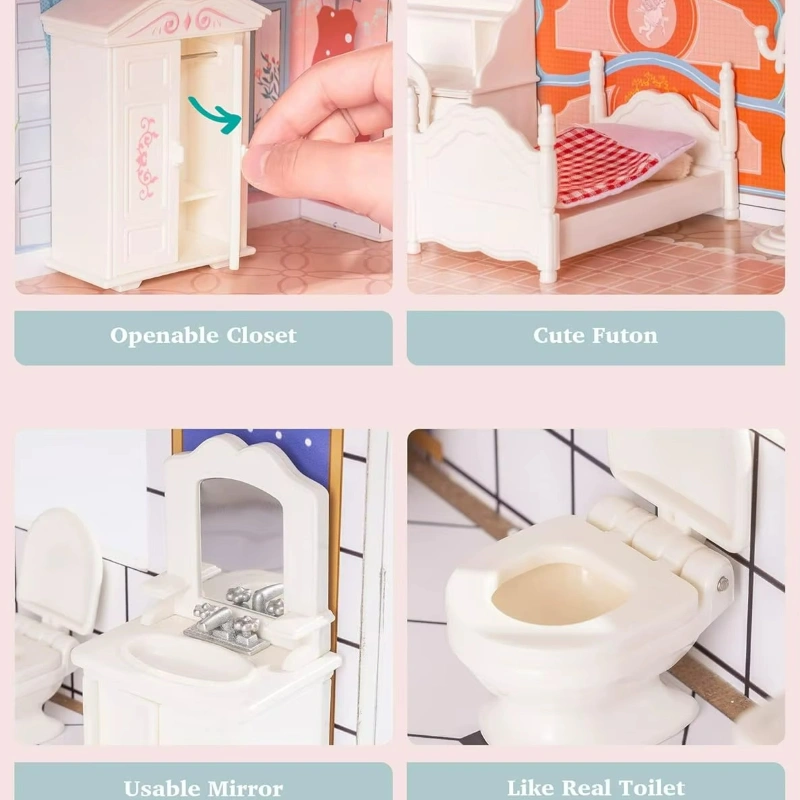 Beautifully detailed: 3 floors, 5 rooms and a balcony, plus 28 lifelike accessories (sofa, lamp, kitchen table & chairs, bathtub, recliner, toilet, bed, and more). Functional cabinet doors, real mirror.